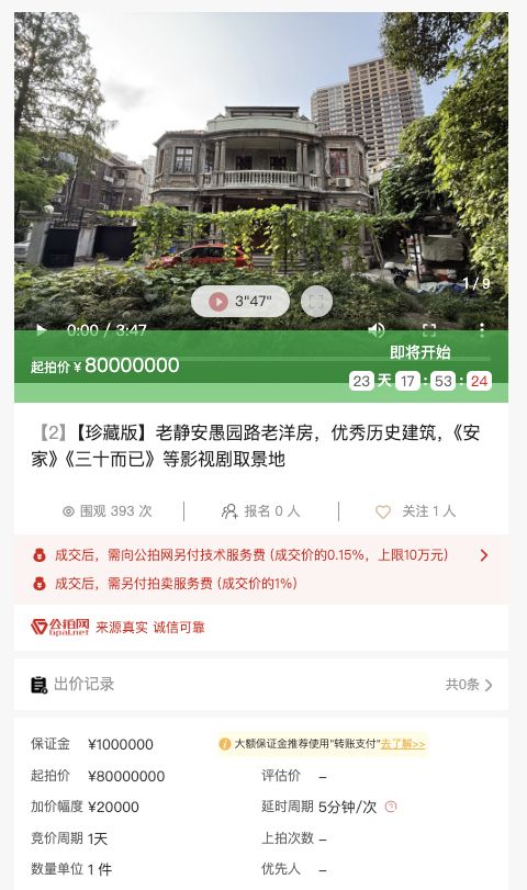 11月13日,红星新闻记者获悉,曾是《一甲》等电视剧拍摄地的世纪上海平房,在经历了三场拍卖失败后,于12月7日第四次拍卖。起拍价降低至8000万元,比首拍降价7000万元。拍卖公司员工刘先生告诉红星新闻记者,此时的起拍价与第三次拍卖没有什么区别,通常都是业主的底价。老房子被拍卖的主要问题是,仍然有两个业主占用面积较小。如果变成独户住宅,价格将会大幅上涨。目前,另外两位业主也同意如果价格合适的话将其出售。 ▲ 拍卖第四信息记者注意到,拍卖平台由阿里拍卖变更为中拍网,起拍价8000万元,拍卖于12月7日开始。此前,老房子已被拍卖过3次。 8月首场拍卖起拍价为1.5亿元。 9月7日结束的第二场拍卖起拍价为9666万元。 10月23日结束的第三次拍卖起拍价下调至8299万元。由于没有人出价,拍卖失败了三次。 13日,拍卖公司工作人员刘先生告诉记者,这个项目的主要问题是它不是独栋建筑。有两位业主,占地面积不大。如果是独栋建筑,造价可超过3亿。我之前也采访过潜在客户。 ▲ 先生陆先生的刘女士表示,被拍卖的平房他们已经和另外两位业主谈过,如果价格合适,他们愿意将其出售,将房子变成家庭财产。购买者购买项目后,可以购买其他使用权建造一座完整的单户花园洋房。今年8月3日,红星新闻报道了老房子拍卖的消息,登上多家平台热搜(此前报道:上海百岁老房子以1.5亿元起拍,单价超过43万/㎡。位于上海愚园路的老平房,土地面积848.75平方米,建筑面积346.66平方米)米,500平方米大院子的小楼,起拍单价43万元/平方米。房子建于1924年,距今已有一百多年了。房子的介绍中还提到,房租到2029年,月租6.75万元,按原样交付。无法预订。评论区提到每天的价格是3000多元。该公司的工作人员告诉记者,房屋交易税是3%的契税,由买家承担。该房屋目前已出租,正在建设为住宿加早餐旅馆。如果成功购买,我们可以讨论是否终止租约。工作人员强调,此次拍卖是社会委托拍卖,并非司法拍卖,不涉及任何纠纷,大家可以放心参与。 ▲ 柳林山庄的招牌据了解,该房屋位于愚园路532弄,属于一栋名为柳林山庄的百年老楼。别墅群拥有10栋独立花园洋房和1栋联排别墅。 《安家》、《三十而已》等影视剧播出后,柳林山庄成为热门打卡地。柳林别墅也是许多名人的旧居。比如,55号房的原主人冯志安,在卢沟桥事变时任第29军第37师师长。率部在卢沟桥与日军英勇作战。红星新闻记者刘亚洲编辑张勋评论王广东