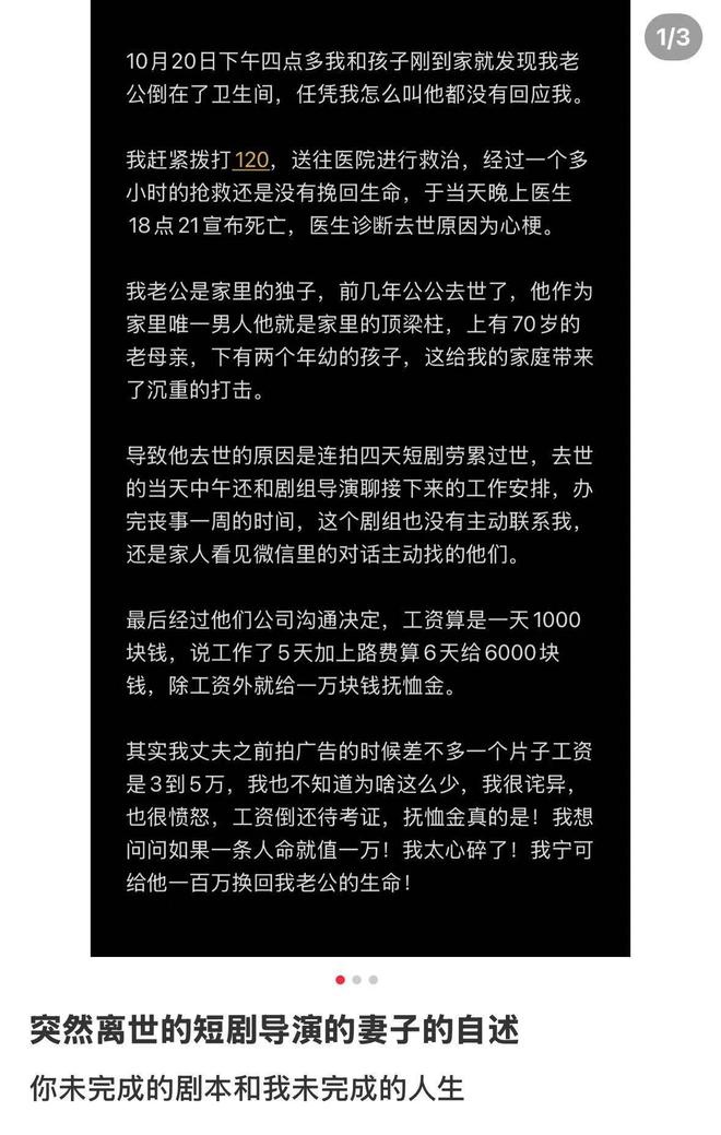 集目新闻记者詹璐和见习记者李淑仪近日,一篇题为《你未完成的剧本和我未完成的人生》的帖子引起了网友的关注。该博主在网上发帖称,她担任短游戏总监的丈夫不幸因心脏病去世。 11月7日晚,博主王女士告诉吉木新闻记者,10月中旬,她的丈夫高先生拍戏回家第三天突然去世。那天中午他还在谈论工作上的事情。高先生去世当天,他的妻子仍在处理该帖子。据王女士交代,10月20日下午,她接儿子回家时,发现丈夫高先生躺在卫生间里。在其他 120 人试图营救失败后,他去世了。当王女士查看王女士的手机时,发现他去世当天中午12点还在和剧组人员通话。据他的工作日志记载,拍摄过程中“一个小时就完成了工作”每天一两点,早上七点又开始。”进入工作模式后,妻子几乎没有休息过。“他是今年5月份开始从事短剧行业的。”据王女士回忆,丈夫从9月底开始参与短剧的拍摄准备,并担任某部短剧的副导演。10月13日,高先生前往郑州剧组,从14日到12日进行了四天的拍摄。 17日,18日15:00左右回到家,“那天他回家后说自己没事,或者是累了,所以我就让她早点睡觉。”王女士说,当天晚上22:00左右,全家人都睡了。当晚8点左右,高先生就在工作台上睡觉了。 20日13:00左右,高先生在微信上问她怎么了,没想到,她发现丈夫在莹在地上。高先生去世后,死因诊断为心肌梗塞。为了不影响丈夫后续工作,高先生去世当天的工作笔记(采访者给出)留下了两个女儿。高先生出生于1981年,2005年认识女士时,他仍在从事摄影器材销售工作。在推销和自学的同时,高先生逐渐爱上了摄影。王女士回忆道,“他一直想和我分享他遇到的有趣时刻,我也会分享给大家。就这样,他一步步学习、成长。”因为热爱,高先生于2010年左右前往北京学习摄影。 “他存钱已经很久了,他真的很喜欢这个行业。”他离开了十年,直到2022年才回到河南开封老家工作。女士介绍。王先生表示,高先生在从事短剧之前,曾在当地一家电视台工作,后来学会了拍摄短片视频和纪录片,后来从事纪录片、广告等创意工作。 “他很认真,对细节要求严格。上班时他很专注,很细心。相反,他在生活中不小心。”她说。王女士告诉记者,高先生心里一直有一个梦想,想拍一部自己一生的纪录片或电影。 “他真是一个脚踏实地、勤奋、执着、眼睛明亮、有梦想、有抱负的人。”此外,高先生是家里唯一的儿子。父亲去世,母亲69岁。他和王舍女士有两个女儿,大女儿10岁,小女儿6岁。目前,大女儿正在学习小提琴,高先生在孩子四岁的时候就为她规划了未来的道路,是一个丈夫,一个负责任的父亲。”王女士说,工作不忙的时候,高先生总是选择孩子,照顾家庭。”我们一家四口喜欢一起看电影、电视,天气好的时候就出去户外活动。”让高先生感到温暖的是,即使在北京工作,高先生也坚持定期和家人视频通话,寒暑假前总是提前安排家庭出游。他的突然离世,让一家四口失去了经济和精神上的支持。“大女儿被同学说‘你没有爸爸了’,她很伤心。”高先生家人的情况(采访者提供)他们签订了雇佣协议,据王女士介绍,距离她丈夫去世已经半个月了,公司只给了她6000元工资。高先生去世当晚,参与生产的公司相关负责人联系了家人,但没有继续沟通,10月27日,王女士的家人收到了“1万元抚恤金”的补偿方案。从另一部分y。 “他今年才44岁,他的余生值一万块钱吗?”说高王女士是家里的经济支柱。他的去世给家庭带来了很大的影响,公司的赔偿金额也是他无法接受的。然而,在王女士搜查物品时,并未发现高先生所签订的劳动合同及涉及公司的相关信息。目前,涉事公司尚未主动联系王女士商讨赔偿事宜。他表示,他的妻子和公司负责人认识很久了,目前希望与公司进行洽谈。极目新闻记者多次尝试联系涉事公司负责人,但电话无法接通。记者联系了几位涉事工作人员,证实该短剧确实是10月中旬在郑州拍摄的,并且是他们与高先生合作的。其中之一aff说,听到高先生去世的消息他感到非常震惊。 “前几天我们刚刚工作,然后他就突然消失了。”他还表示,短剧的拍摄真是及时又费力。对于记者提出的不签订劳动合同是否合法的问题,他也表示,“需要考虑”。 (来源:极目新闻)