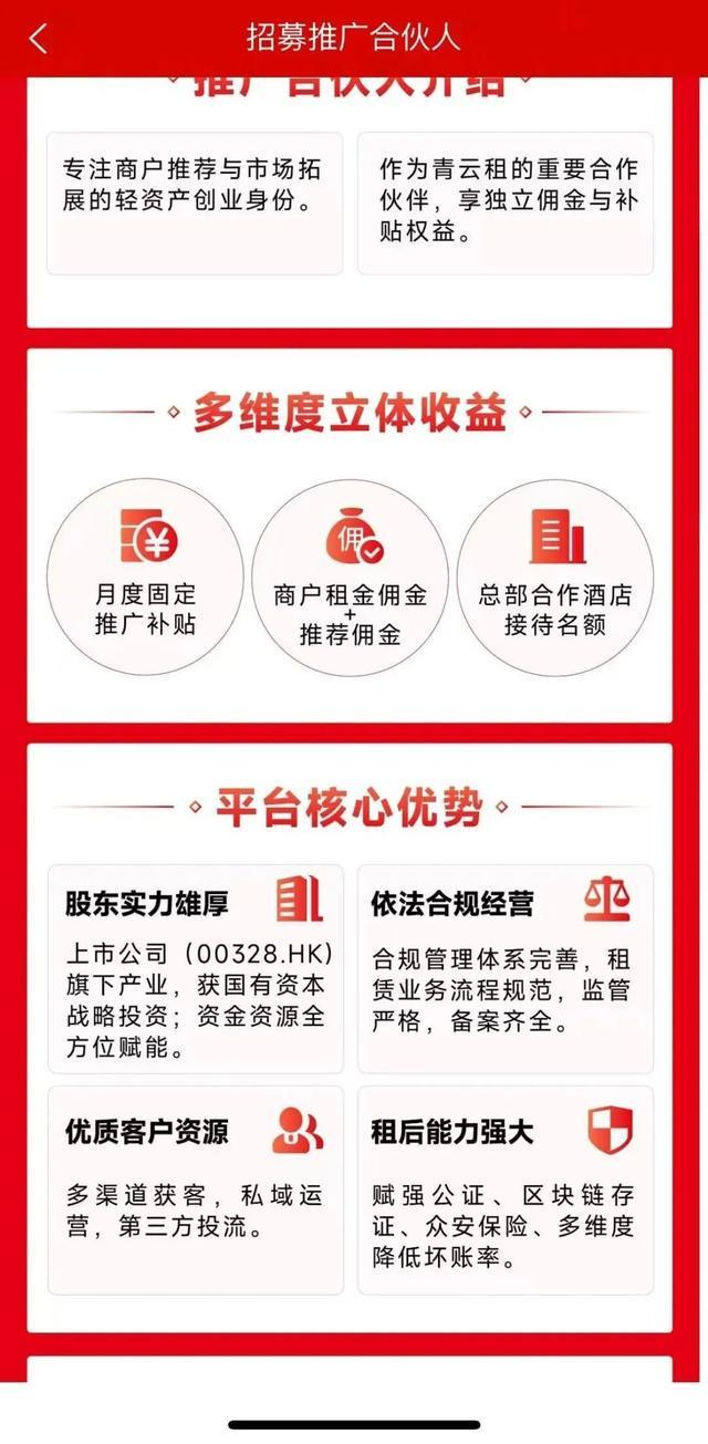 近日,有消息称,曾经在全国拥有300家门店的手机租赁平台青云租突然爆发:供应链断裂、员工拖欠工资、总部解散,留下超过10亿元的资金缺口。数以千计的投资者数千元至数百万元的投资被杀,而这些投资大多来自亲友的相互推荐。另据悉,“青云租赁”曾招募交易员对其进行投资,资金已兑换成各种型号的苹果手机。之后,平台将手机出租出去,收取租金差额。投入的手机越多、时间越长,收入就越高。据称,年回报率为16.8%。今年9月以来,“青云租赁”出现“提现困难”,大量投资者尚未收回本金数十万甚至数百万。号称年化收益率16.8%、9月底出现赎回问题的“青云租赁”一直标榜自己是手机租赁平台的龙头。从App页面到线下招商海报,“青云租赁”向外界宣称自己拥有“强大的固定实力”。是上市公司旗下的产业,业务遍及200多个城市,累计服务用户超过100万。 “青云租赁”页面合作伙伴招募和推广的规模,成为“青云租赁”吸引未来投资者的重要说辞。 “由于客户数量较多,企业订单量较大,公司业务不断扩大,需要更多贸易商入驻。”据介绍,“青云租赁”公司的运营模式主要是吸引社会人士投资,将资金转化为各种模式的租赁服务。苹果手机。投资者依靠平台租赁手机并收取租金差额。以苹果iPhone 16 Pro Max手机为例,平台以9760元的价格购买并租用4个月即可赚取10306元,实现投资回报。投资期限分为四个月、六个月、十二个月。投资时间越长,收益越高,年利率将更高,达到16.8%。媒体浏览“青云租赁”APP“招募推广合作伙伴”页面发现,期数的计算方式为:期数=租赁套餐期数×手机数量。因此,平台鼓励投资者进行“长期、多股”投资。该图展示了商家的收入模式。投资人小李表示,他是在朋友介绍下参与投资的。 “我当时投资了12万元。一开始,机智的hdrawal 顺利且快速。提取了2万多元。然而从9月份开始就完全无法取款了。我和朋友总共有近50万元。”9月份几乎所有投资者都开始意识到不对劲。投资者佳佳的哥哥在“青云租赁”工作,9月底异常提款后,他就问家人公司有没有什么异常情况。“当时他告诉我可能是国庆的缘故,但后来假期结束了,钱还没到,我就知道了一些事情。”据近日媒体报道,来自宁波的董先生举报,他在“青云出租”租赁平台上放置了66部总价超过50万元的苹果手机,不但拿到了全部租金,而且手机也没有归还。董先生将总价超过50万元的66部苹果手机放在了“青云出租”租赁平台上进行出租。“青云租赁”平台。据平台数据统计,66款手机总价超过56万元。租金提现金额超过23.5万。董先生表示,今年9月底,现金出库平台运行出现问题。董先生表示,今年9月底,平台功能下架时出现问题。记录显示,直到9月28日才完成提现,随后提现显示正在审核中。此外,据悉,9月中旬以来,网友纷纷发帖称“青云出租”系统退出失败,还有网友称员工也发帖称自己被拖欠工资。 “青云珠”遭质疑,但大量账户“辟谣”,称公司业务稳定、资金充足,因疫情导致提现延迟有改革、融资等原因。很快,该账号“辟谣”就开始维权。武汉市民于婷(化名)说,今年1月,他在朋友的劝说下登上了公交车。他在学校工作,工资中等。第一阶段他只投入了9万元。 “有需要的就下载app,注册一下,绑定银行卡,钱已经兑换了十几部iPhone了,以后就不用操心了,到期了就可以提现,第一季我就赚了一万多块钱。”于婷表示,这次他也感觉有些不对劲,但对方是他多年的朋友。夫妻俩都是“青云租赁”公司的员工,自称投资超过100万,这让他放松了警惕。 “相信他们的专业判断。他们说时不时地想合并订单,所以我就把钱转给了他们。最后一笔钱投入后不久,于婷发现账户无法取款。问完后,他得到了“公司正在进行股改”、“老股东撤资,新股东后来来”等话语安慰。于婷不断看到网上有人询问“青云出租”丑闻,又询问这位朋友,对方却抱怨道,“你现在才知道。”于婷发现账号无法恢复,询问公司工作人员。与投资者的经济损失相比,员工的遭遇更加荒唐。庆云租了一间办公空间,“工作一个月,拿回扣32万元”。据报道,一名网名“青云人惠为”的员工在社交平台上讲述了自己被“打工费”欺骗的经历。他申请了初级投资经理的职位。他在接受采访时澄清,on将负责手机租赁业务,他并没有提到任何要求自己购买手机的事情。但入职一个月后,他不仅没有拿到任何工资,公司还以“办理手续”、“资产调整”为由拖欠了他的工资。后来,公司强迫员工自己购买iPhone 16和iPhone 17手机,拒绝购买的人被要求加班到晚上8点。每天。为了保住工作,包括他在内的数千名员工被迫花钱购买机器。 “当骗局败露后,我发现全国有1000多名同事也经历了同样的过程,这是一个精心策划的骗局。”该员工自今年10月31日起在某短视频平台曝光了自己被骗的经历。 “现在,我必须用我的亲身经历,来看看聘用青云的陷阱,求职者一定要避雷。”官方p刚刚成为香港上市公司子公司的青云租赁公共账户和小程序声称,该公司是香港主板上市公司爱高集团的子公司,由国有基金持有。工商信息显示,“青云出租”的运营方为武汉青青时代网络科技有限公司,成立于2020年,注册资本1.5亿元。深圳市爱高创新科技控股有限公司持有公司55%的股份。今年8月22日,集团公告称,旗下间接全资子公司有限公司以交易