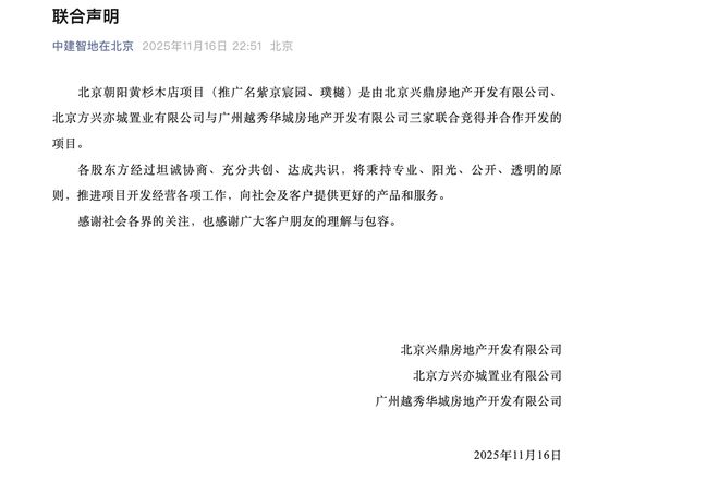 财经财经 严明辉中建智慧置地与越秀发布联合声明,具体内容如下:北京朝阳黄山木店项目(升级为紫荆辰源、璞悦)是北京兴鼎置业有限公司与广州越秀华城房地产开发有限公司共同开发的共赢项目,经过充分讨论、充分共创、一致同意,全体股东坚持专业、阳光、公开、透明的原则,推动项目开发运营,为项目提供优质的服务。为社会和客户提供更好的产品和服务。感谢社会各界的关注,感谢广大客户朋友的理解和包容。北京兴鼎房地产开发有限公司 北京方兴易城房地产有限公司 特别声明:以上内容(如有,包括照片或视频)由自媒体平台“网易”用户上传发布账户”。本平台仅提供信息存储服务。