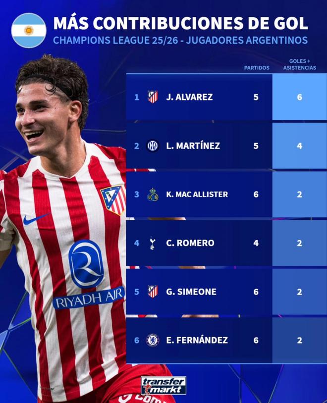 德专列出了本赛季阿根廷球员在欧冠联赛中的进球数。马竞前锋阿尔瓦雷斯以6个进球排名第一,国际米兰前锋劳塔罗以4个进球排名第二。本赛季欧冠阿根廷球员进球榜1-马竞阿尔瓦雷斯(出场5次,参与6球)2-国际米兰劳塔罗·马丁内斯(出场5次,参与4球)3-圣吉洛斯联凯文·麦卡利斯特(出场6次,参与2球)4-热刺罗梅罗(出场4次,参与2球)5-马竞西蒙尼(出场6次,参与2球)6-切尔西恩佐·费尔南德斯(出场6次,参与2球)【咪咕独家观看英超】